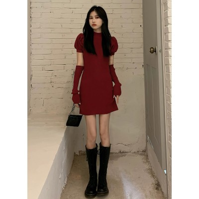 长袖连衣裙女泡泡袖淑女针织连衣裙 S